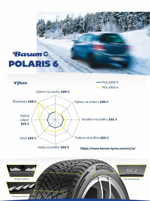 Barum Polaris 6 v porovnání s modelem Polaris 5 přináší o 8 % delší životnost, snížený valivý odpor a hlučnost, lepší výkon na sněhu a nový šípový dezén ve tvaru ‚V‘, který zvyšuje stabilitu a trakci v zimních podmínkách.